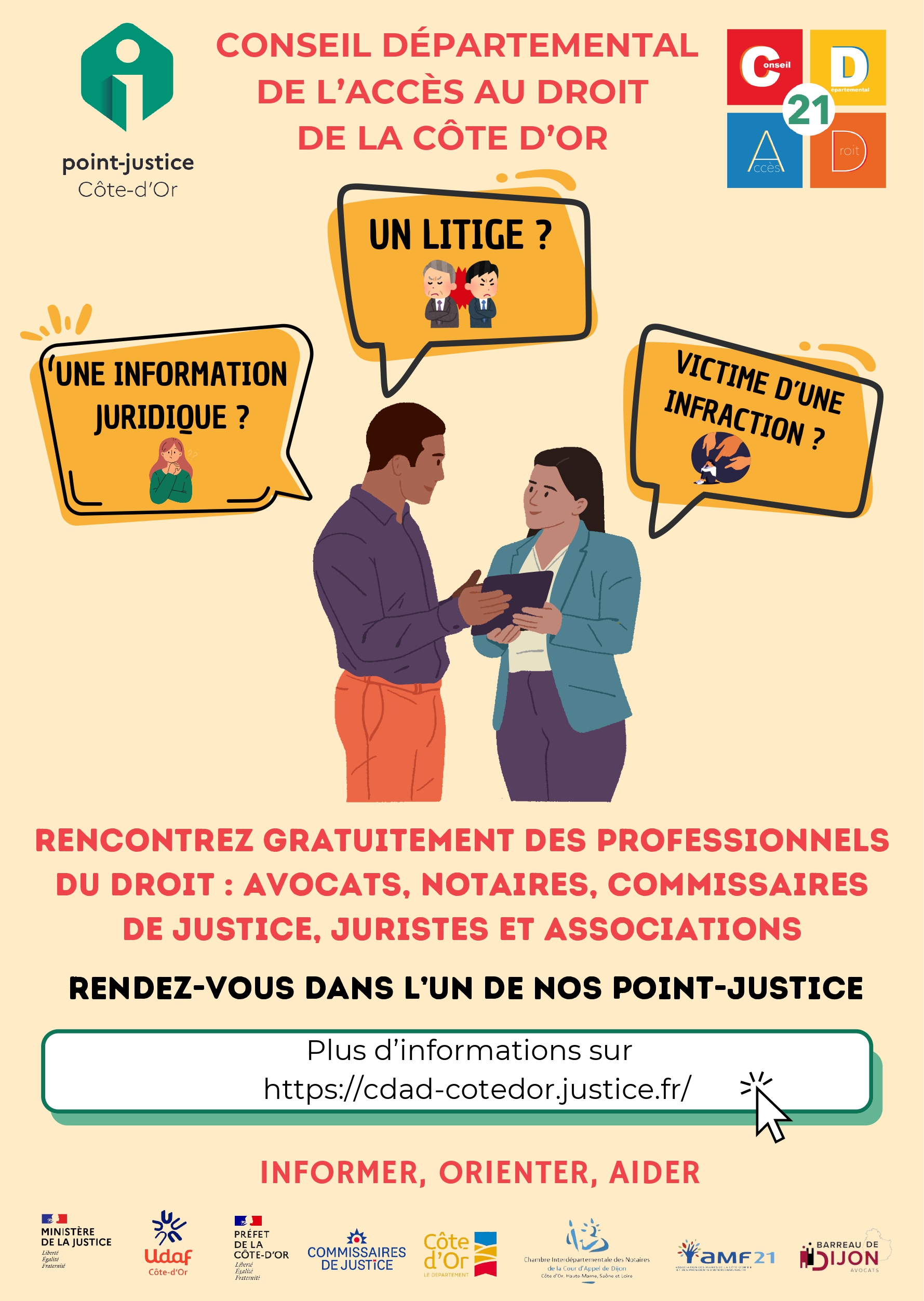 Le CDAD 21 est là pour vous répondre à vos questions, vous accompagner dans vos démarches juridiques et vous orienter vers les bons interlocuteurs.